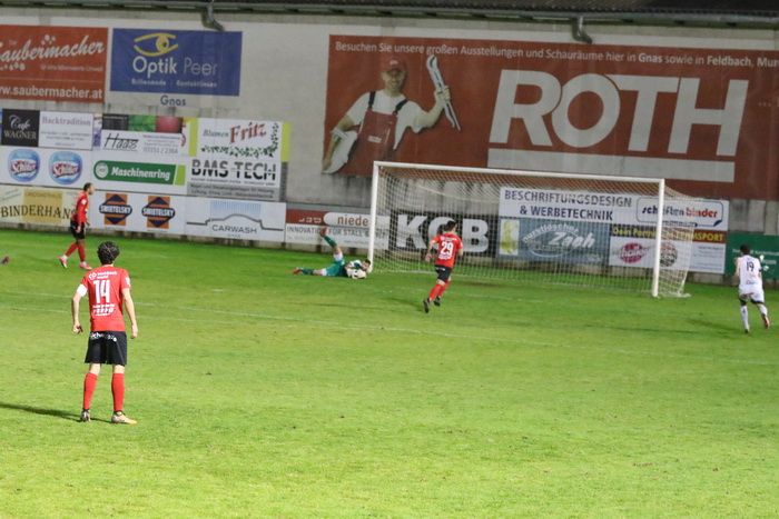Von Beginn weg übernahmen die Gnaser die Initiative und spielten in den ersten 45 Minuten groß auf. In der 10. Minute konnten die Gnaser in Führung gehen. Rene Wagist spielte auf der linken Seite weiter zu Maxi Opferkuch und der bediente Raphael Kniewallner mit schönem Pass. Diese Chance ließ sich Kniewallner nicht entgehen und stellte auf 1:0.