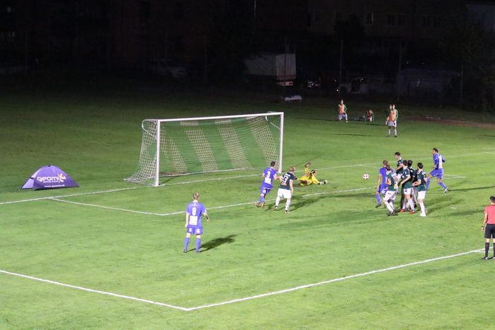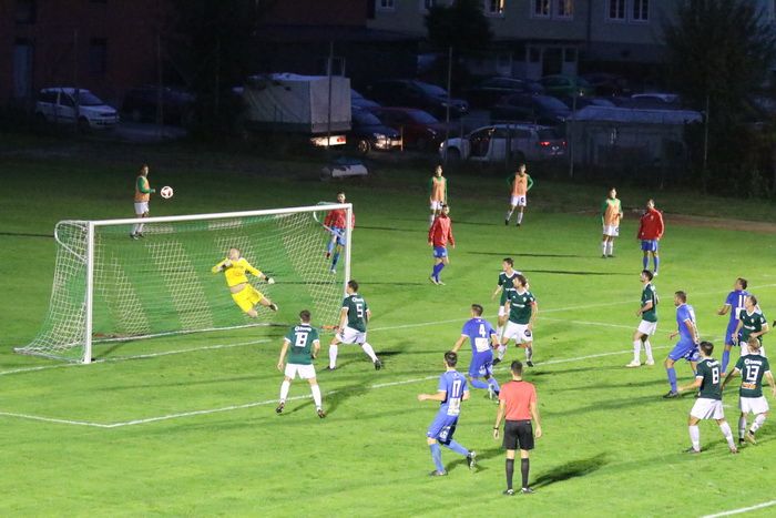Einen Eckball köpfelt David Friedl (Nr. 11) aufs Tor, Daniel Bartosch wehrt zur Ecke ab (54.).