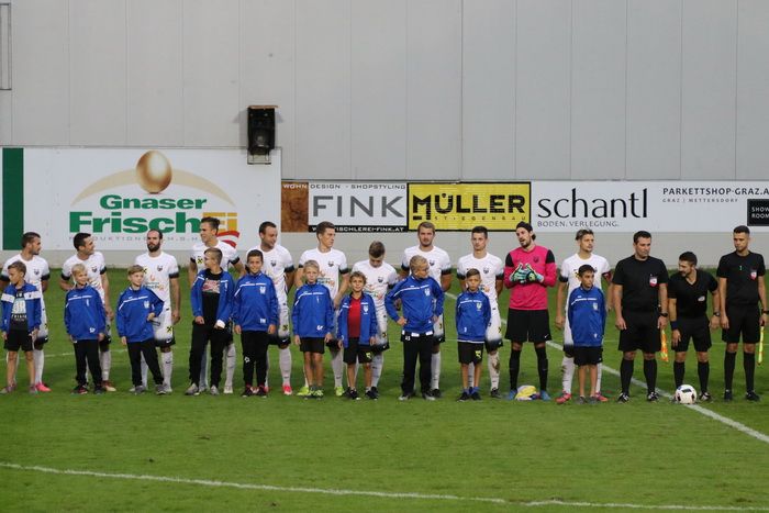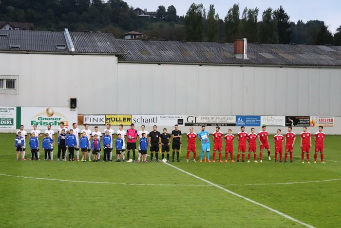 In der 19. Minute gingen die Gäste mit 1:0 in Führung. Ex-GAK-Spieler Gernot Kraut flankte von der rechten Seite zur Mitte, Alex Roth schlug den Ball zur Seite, Jürgen Hiden kam ans Leder und hob den Ball über Roth hinweg ins lange Eck.
