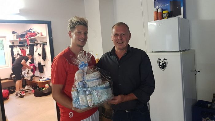 Vor dem Spiel erhielt Jungvater, Kapitän Daniel Luttenberger-Haas vom Vorstand eine Windeltorte überreicht.