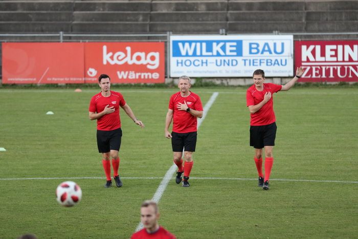 Schiedsrichter Michael Spörk (mitte), Gernot Kollmann (rechts) und Tarik Sahbegovic beim Aufwärmen.