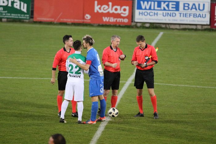Handschlag zwischen Gnas-Kapitän Daniel Luttenberger-Haas und DSV-Kapitän Martin Petkov.