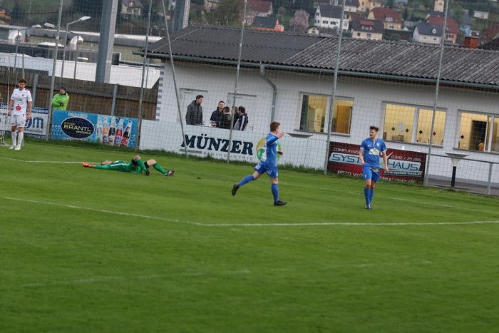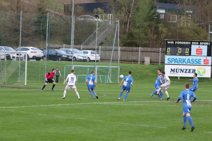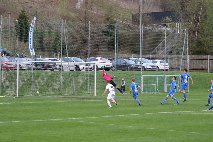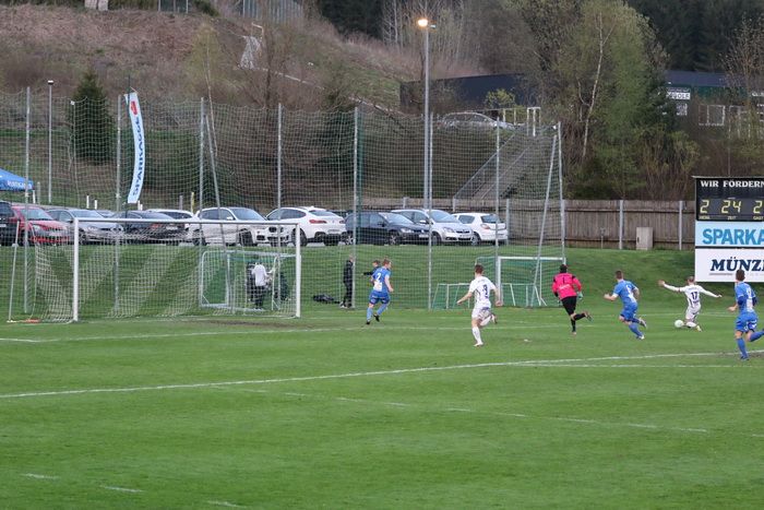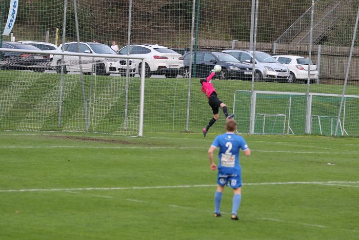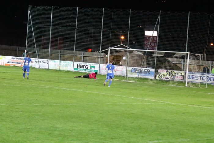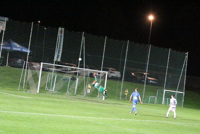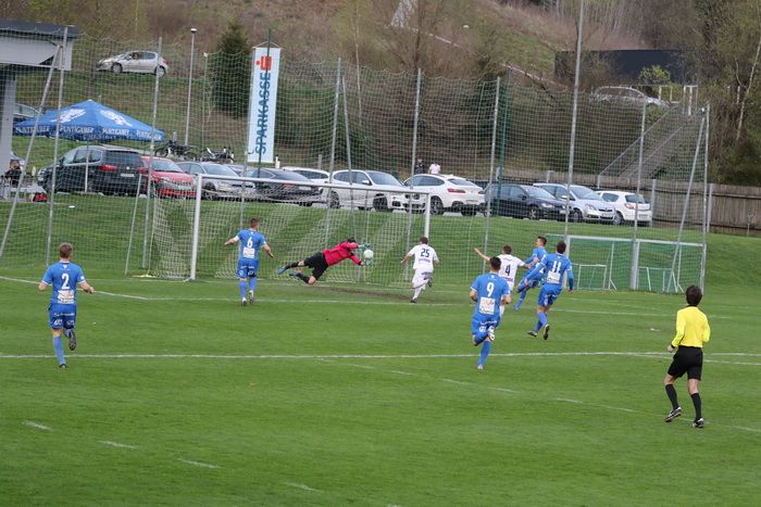 Auf der anderen Seite kann Torhüter Markus Hiebler einen Scheucher-Schuss abwehren (78.).