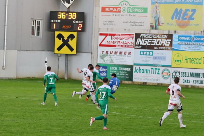 Gnas-Torhüter Alex Roth rettete in der 37. Minute vor dem anstürmenden Tomic. Kurz vor dem Pausenpfiff versuchte es auf der anderen Seite Maxi Opferkuch mit einem satten Schuss aus rund 20 m, Keeper Petrovcic wehrte mit toller Parade ab.