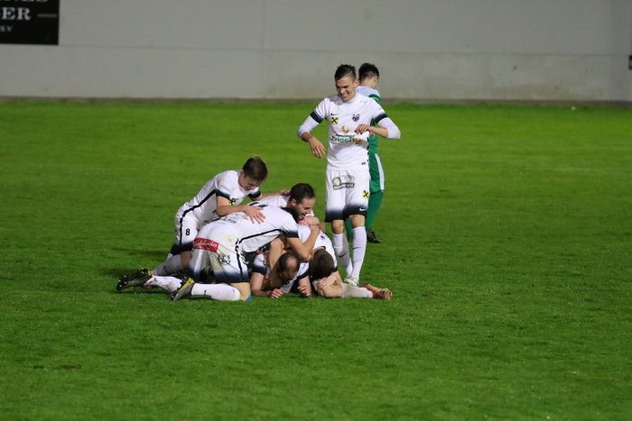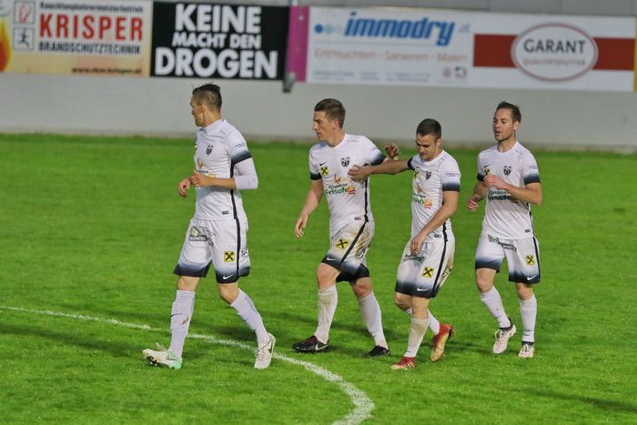 David Fink (ganz links) hat nach Friedl-Hereingabe von der rechten Seite soeben das 3:2 erzielt...