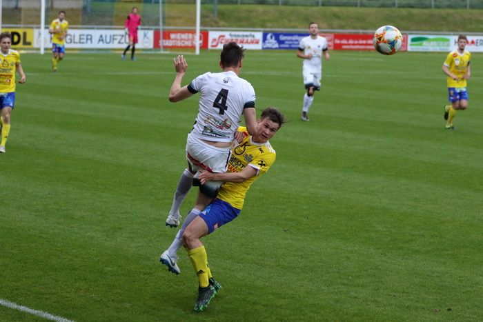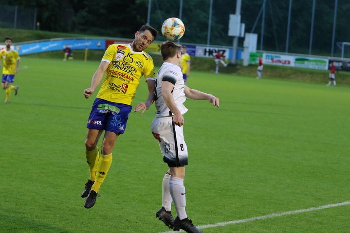 Gnas-Verteidiger Rene Wagist springt höher als sein Gegner, Lorenz Leskosek.