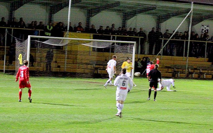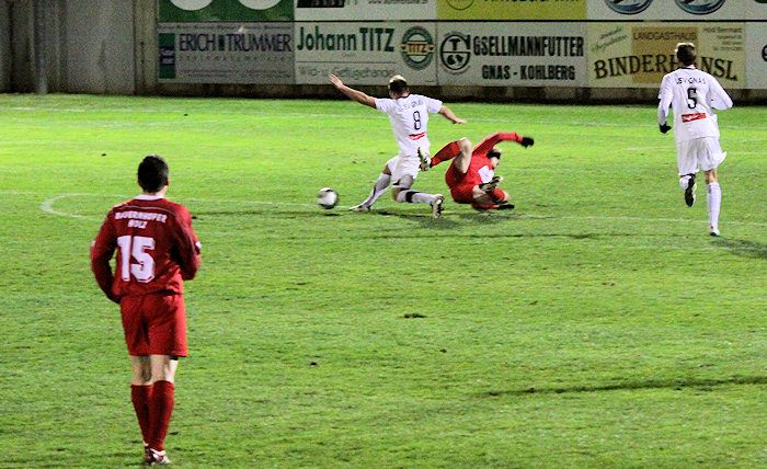 Alfred Geigl mit einer Grätsche gegen Michael Cividino, der Schuss wird zur Ecke abgefälscht.