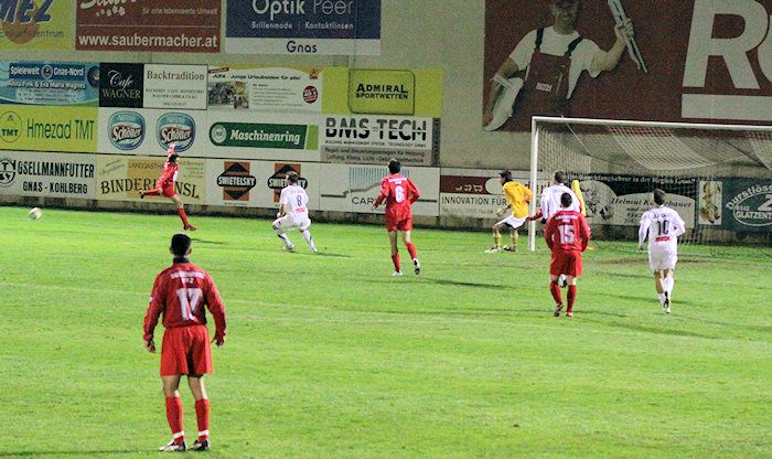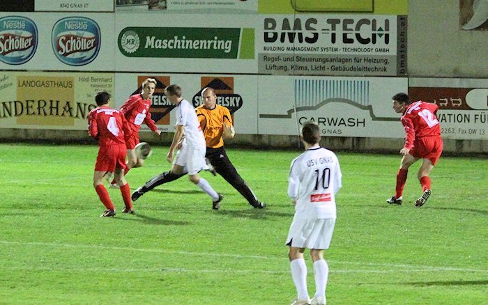 In der 17. Minute gab es Freistoß für Gnas. Wohlmuth brachte den Ball in den Strafraum, der Torhüter faustete den Ball in die Höhe, Christoph Haas köpfelte in Richtung Tor und Christian Schadler, der dahinter stand, schoss den Ball mit einer Drehung ins Tor. Schiedsrichter Feldbaumer entschied zuerst auf Abseits, nach Befragung seines Assisten Schuhajek gab er doch Tor für Gnas. Auf zwei Fotos ist keine Abseitsstellung des Torschützen erkenntlich.