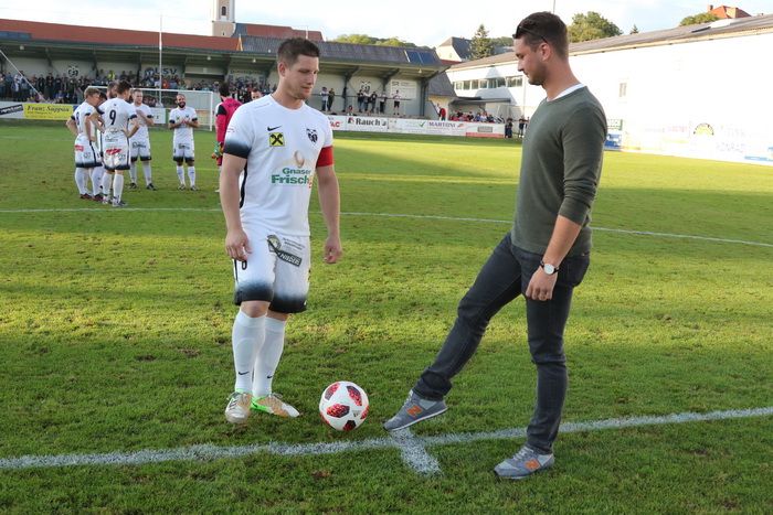 Den Ehrenanstoß nimmt der Match- und Matchballsponsor, der Leiter des Fachmarktes Roth in Gnas, Fabian Orlanduccio vor.