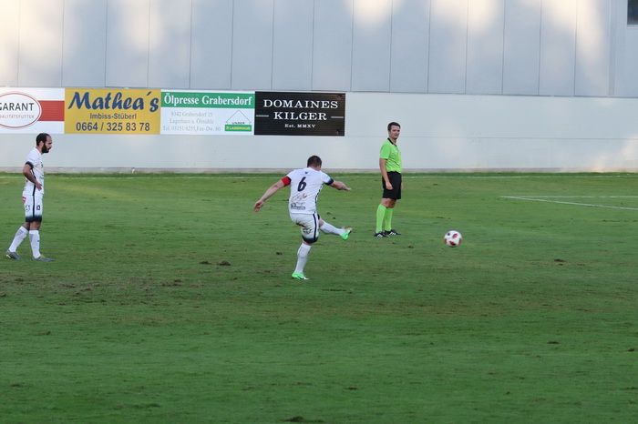 Gnas-Kapitän Matthias Schadler tritt einen Freistoß aus rund 30 m Entfernung...