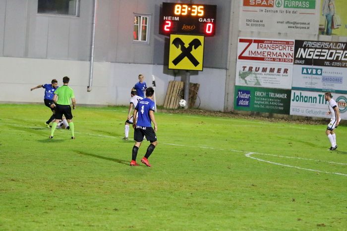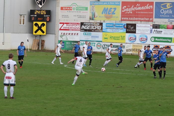 Rund 650 Zusher sahen ein rassiges Derby und ein starkes Spiel der Gnaser. Kapitän Matthias Schadler brachte sein Team mit einem wuchtigen 30 m-Freistoß in der 16. Minute mit 1:0 in Führung. Daniel Zimmermann erhöhte mit einem sehenswerten Seitfallzieher nach herrlichem Spielzug und Hereingabe von Raphael Kniewallner in der 35. Minute auf 2:0. Die beste Chance der Gäste fand Kapitän Lukas Stadler in der 31. Minute vor, als er eine Flanke von Alexander Fuchshofer knapp am Tor vorbeiköpfte. Verdiente 2:0-Führung für die Heimischen zur Pause.