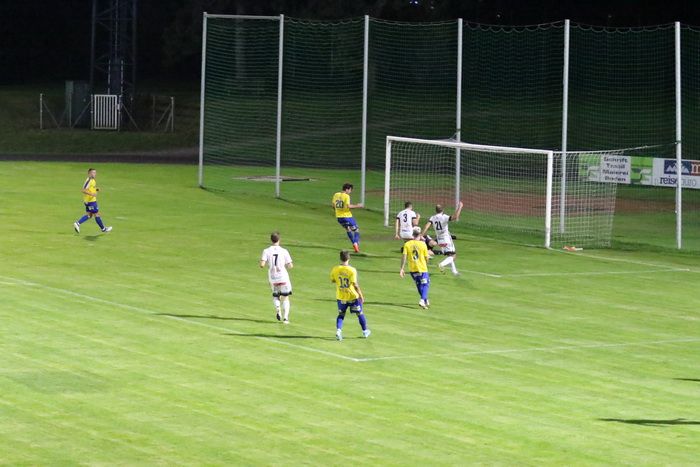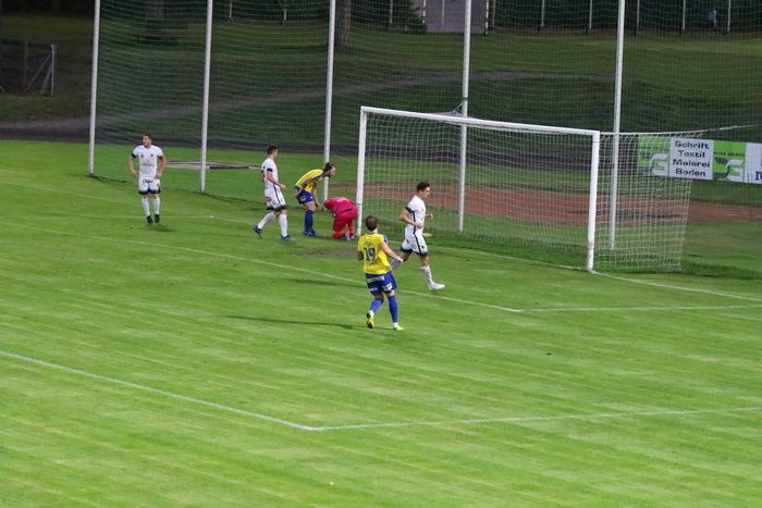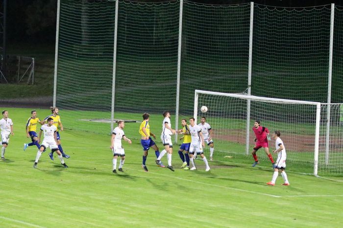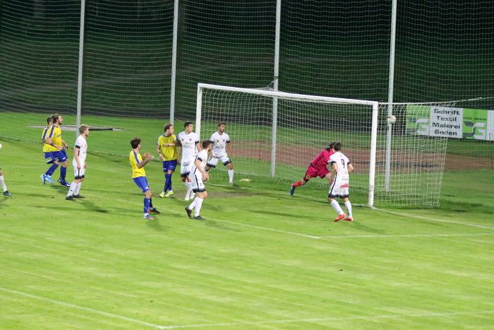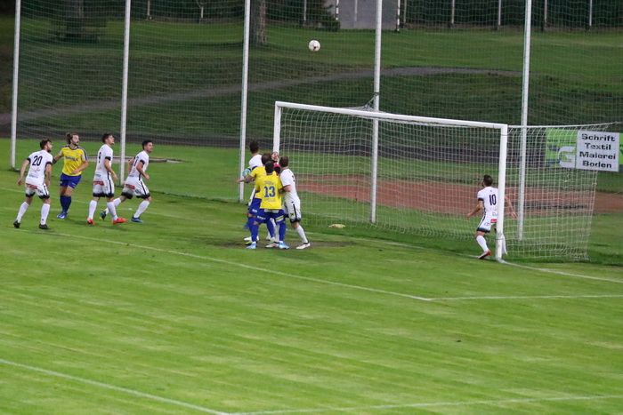 Christian Schadler (Nr. 17) köpft einen Eckball übers Tor (45.). Pausenstand 1:1.