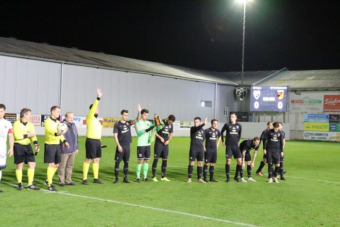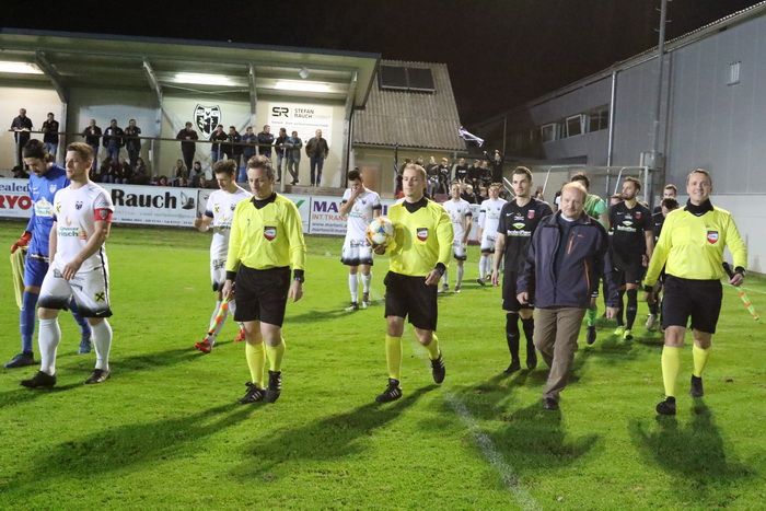Das weststeirische Schiedsrichterteam führt die Mannschaften aufs Feld.