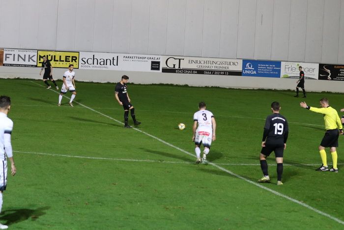 Erster Schussversuch von Gnas-Mittelfeldspieler David Fink (Nr. 13) in der 9. Minute.