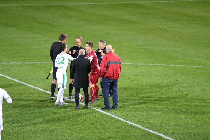 Zuerst erhält Armin Masovic die gelbe Karte für Kritik, dann führt er einen Freistoß aus...