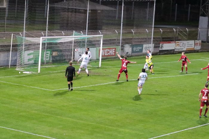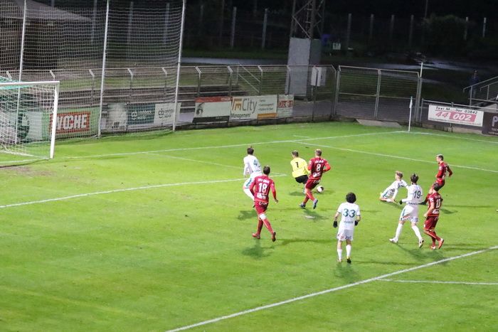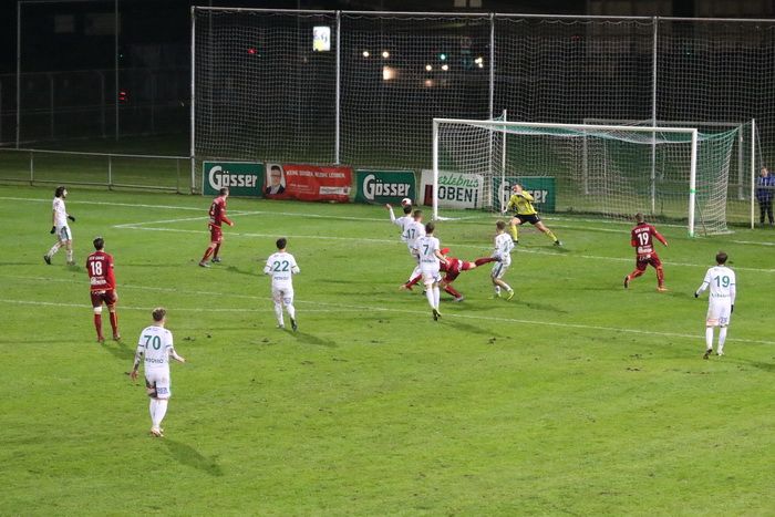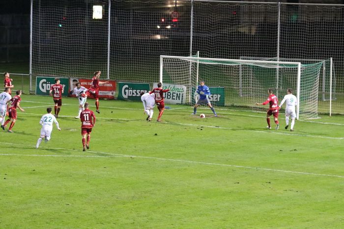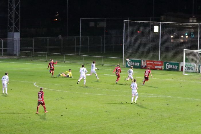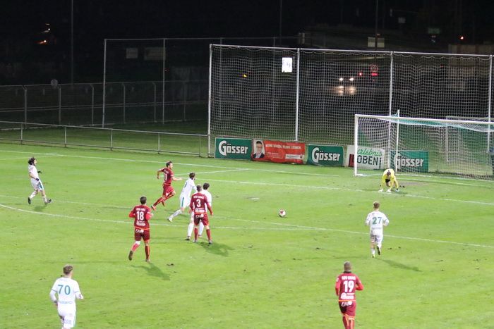 Der Stanglpass von Gjin Gjinaj (nicht am Bild) geht an Freund und Feind vorbei ins Torout (25.).