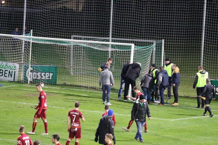 Ab der 33. Minute war das Spiel für 11 Minuten unterbrochen, da nach einem Masovic-Freistoß Lukas Tomic an die Stange geprallt war und diese dadurch geknickt wurde. Gnas-Stürmer Raphael Kniewallner vergab zwei tolle Chancen (9.,22.) im ersten Spielabschnitt, scheiterte jedoch stets an der Abwehr von Torhüter Admir Peckovic. Kurz vor dem Pausenpfiff versuchte Philipp Scheucher mit einem Flachschuss sein Glück, Peckovic konnte zur Ecke abwehren. Pausenstand 1:0 für die Gäste aus Gnas.