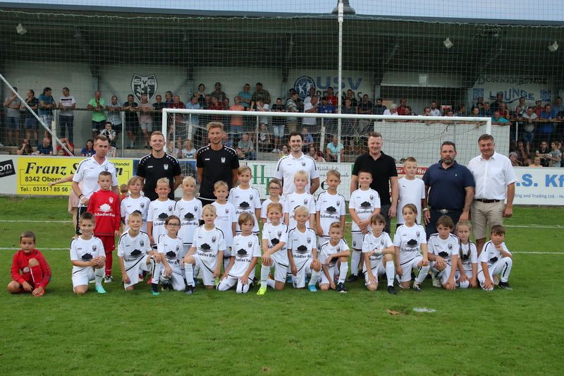 In der Pause zeigen sich die U8, U9, und U10-Spieler mit den neuen Dressen der Firma Schadler Bau.