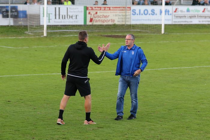 Bruck/M-Trainer Hermann Zrim begrüßt Gnas-Trainer Marko Kovacevic.