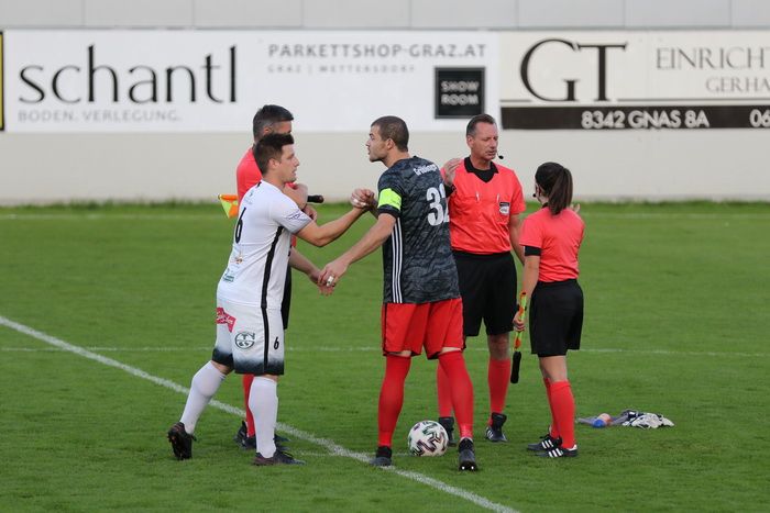 Handschlag zwischen Bruck-Kapitän Philipp Gröblinger und Gnas-Kapitän Matthias Schadler.