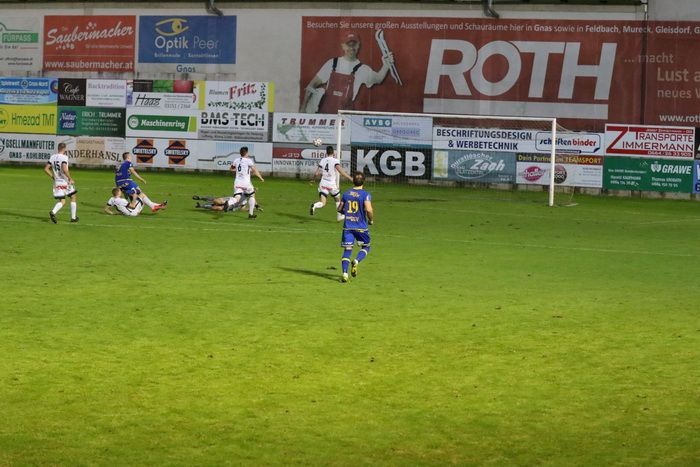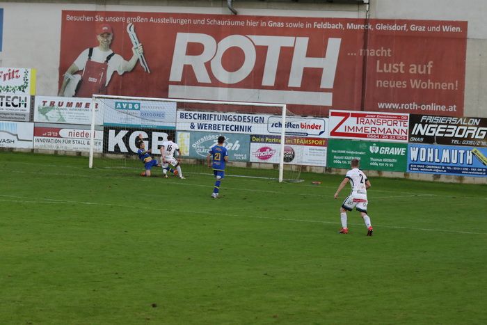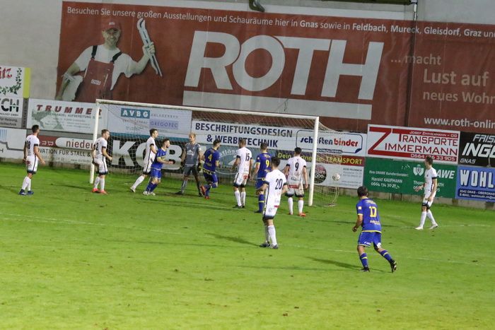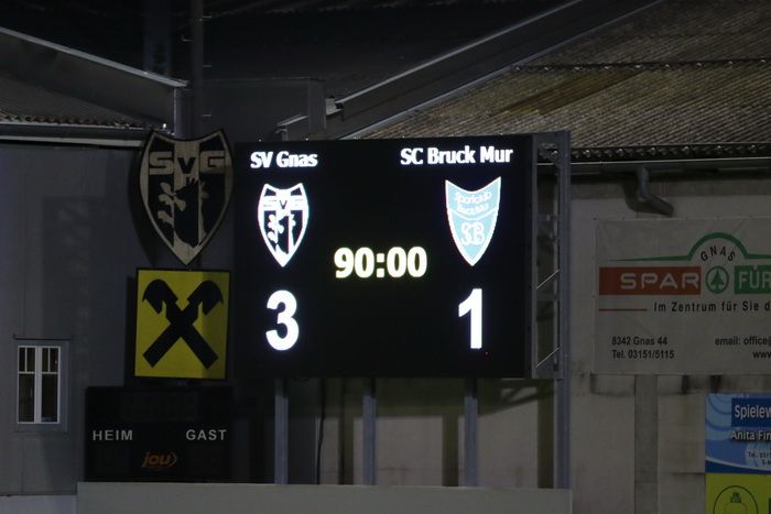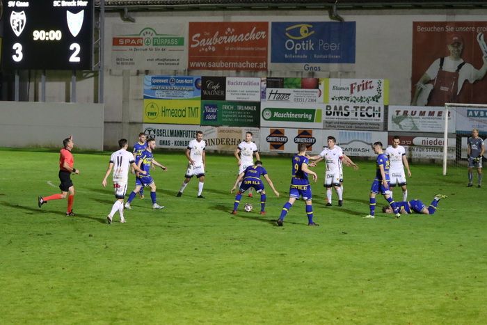Gabriel Puntigam erzielte nach Vorarbeit von Raphael Kniewallner in der 48. Minute das 2:0 für Gnas. Aus einem Elfer fiel in der 50. Minute durch Lukas Stadler der 1:2-Anschlusstreffer für Bruck. Stefan Klenner hatte zuvor Lukas Tomic im Strafraum gefoult. Daniel Zimmermanngelang nach einem von Stefan Klenner per Kopf verlängerten Outeinwurf das 3:1 für die Gnaser (52.). In der 85. Minute hatte Raphael Kniewallner das nächste Tor vor den Beinen, aber Bruck-Goalie Gröblinger wehrte zur Ecke ab. Aufgrund von Unterbrechungen durch Verletzungen gab es 6 Minuten Nachspielzeit. Und da schlugen die Brucker durch Aleksandar Shalev zum 2:3 (92.) und durch David Harrer, der einen 18-Meter Freistoß in der 94. Minute zum 3:3 im rechten Eck versenkte, zu. Damit gaben die Gnaser in der Nachspielzeit einen 2-Tore Vorsprung und einen sicher scheindenden Sieg noch aus der Hand.