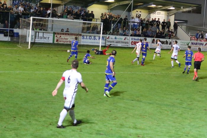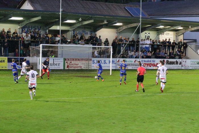 Raphael Kniewallner (Nr. 3) vergibt die Riesenchance auf das 4:1, Gröblinger wehrt zur Ecke ab (85.).