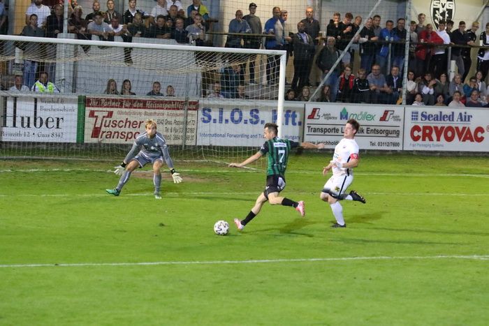 Herbert Rauter läuft auf Gnas-Goalie Michael Sammer zu...