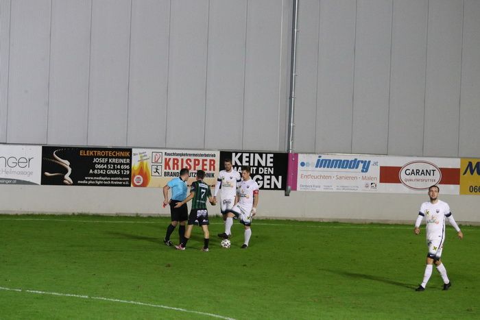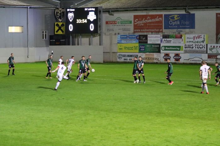 Eine ebenbürtige Partie in den ersten 45 Minuten, bei dem beide Mannschaften je zwei gute Möglichkeiten vorfanden. Ein Klenner-Kopfball wurde Beute des gegnerischen Torhüters (13.) und ein scharf getretener Freistoß von Matthias Schadler verfehlte knapp das Ziel (34.). Die größte Chance im ersten Abschnitt fand jedoch der Lebringer Herbert Rauter vor, der das Leder knapp am Tor von Goalie Michael Sammer vorbeischob (16.). Kurz vor der Pause kamen die Gnaser zu einer guten Möglichkeit, Daniel Luttenberger-Haas wurde nach Zuspiel von Stefan Strohmaier wegen Abseitsstellung zurückgepfiffen. Nach Videostudium stellte sich dies jedoch als Fehlentscheidung heraus. Pausenstand 0:0.