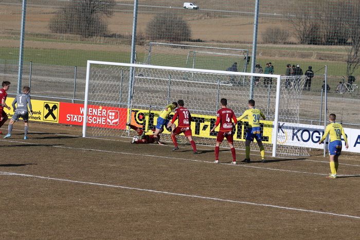 Die Lafnitz-Abwehr bringt den Freistoßball von Tobias Kölli nicht weg, Thomas Suppan (Nr. 15) kommt Augenblicke später ans Leder und schießt zum 2:3 ein.