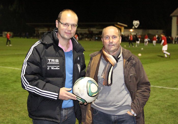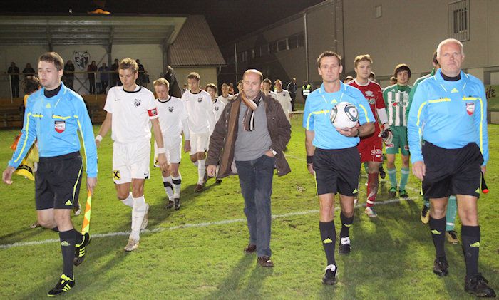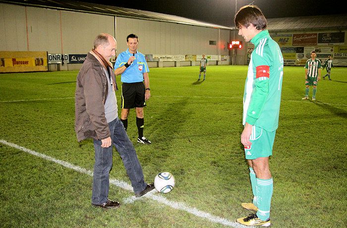 Alois Niederl nimmt den Ehrenanstoß vor. Rechts Straden-Kapitän Christoph Fink.