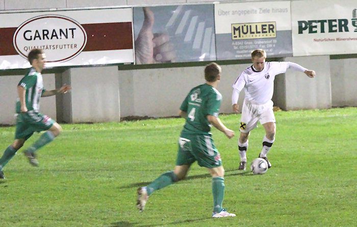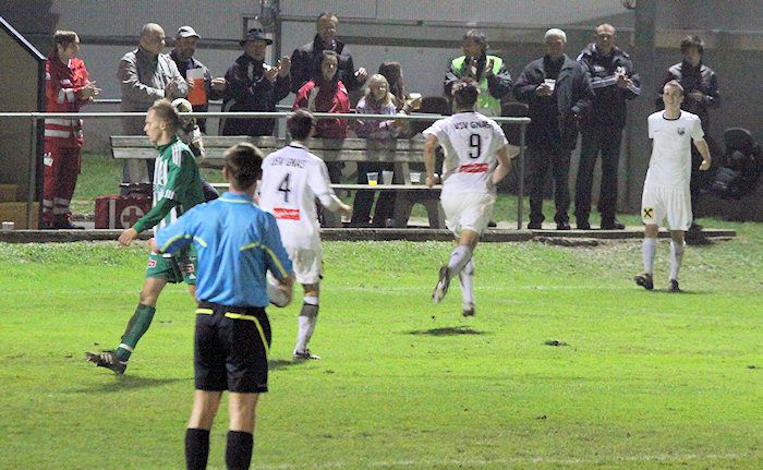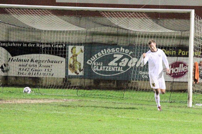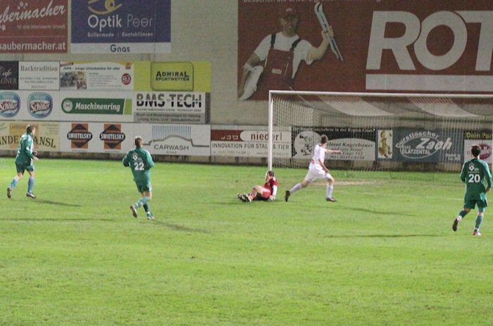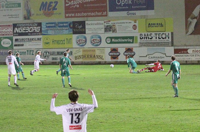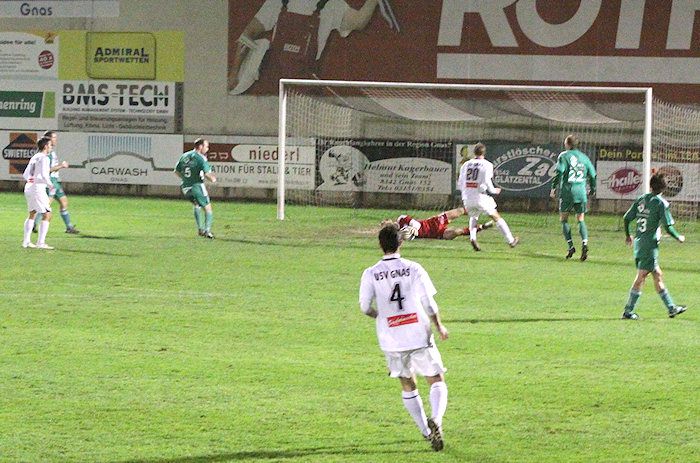 Die Angriffsbemühungen der Gnaser wurden in der 29. Minute von Erfolg gekrönt. Matthias Schadler setzte mit schönem Lochpass Kniewallner ein. Der Jungstürmer rannte der gegnerischen Abwehr auf und davon und schob die Kugel an Tormann Tafilaj vorbei zum 1:0 ins Netz. Sein erstes Tor seit der 4. Runde.