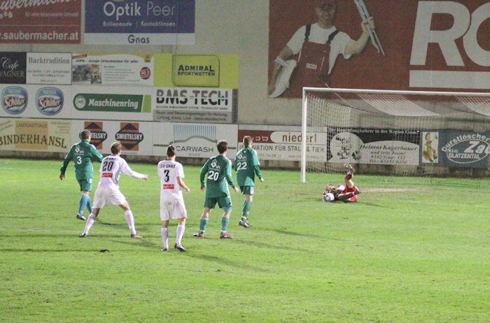 Ein weiterer schöner Angriff der Gnaser über die rechte Seite brachte in der 64. Minute das 3:0 für die Hausherren. Kniewallner lief seinem Gegenspieler davon und passte zur Mitte. Daniel Haas setzte sich gegen Christoph Fink durch und schoss an Torhüter Tafilaj vorbei in die rechte Ecke.