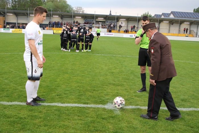 Die Freiw. Feuerwehr Trössing spendete den Matchball. Johann Strasser nimmt den Ehrenanstoß vor.