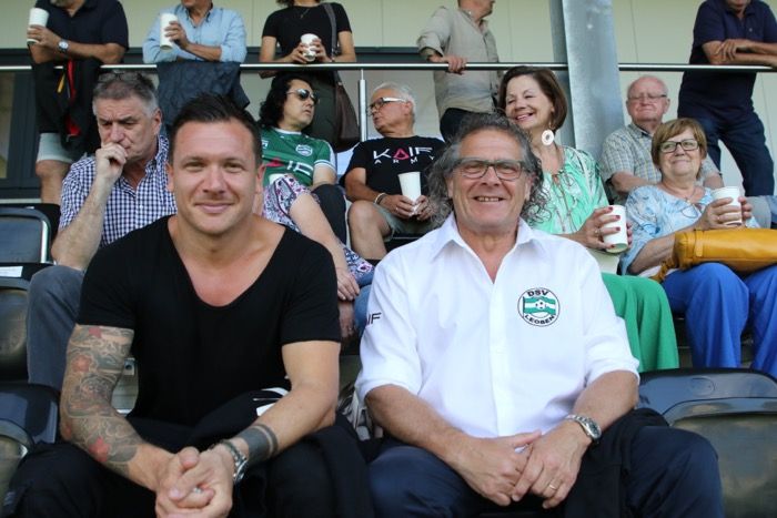 Sky Sport Austria-Reporter Marko Stankovic und sein Vater, Präsident des DSV Leoben, Dejan Stankovic haben auf der Tribüne Platz genommen.