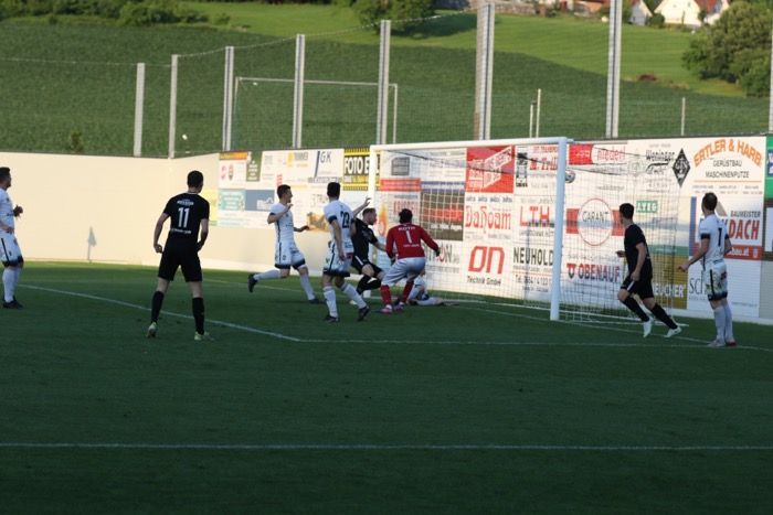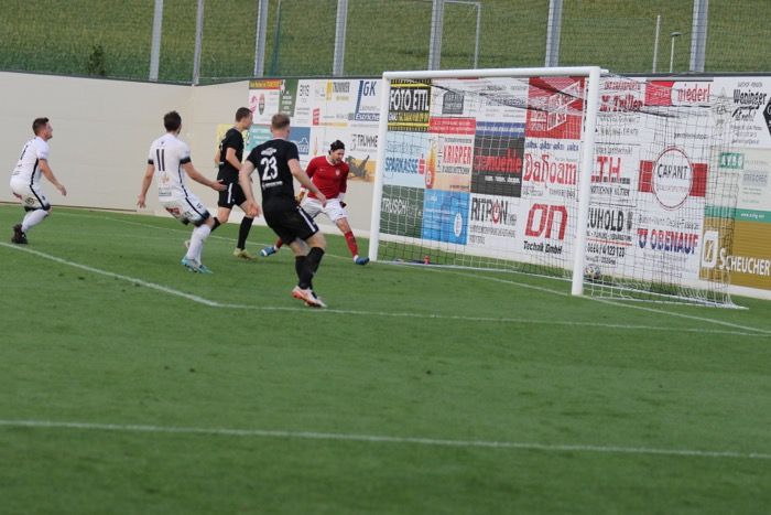 Stefan Strohmaier (am Boden) drückt das Leder nach Zuspiel von Raphael Kniewallner (rechts) über die Torlinie.