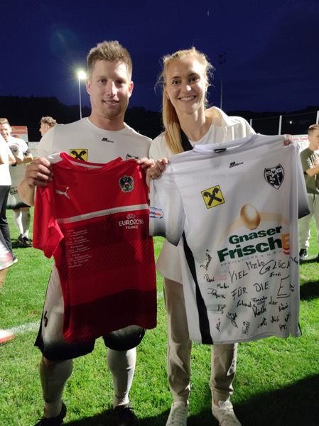 Ein SVG-Trikot mit den Unterschriften der Spieler und Glückwünsche für die bevorstehende EM für die ÖFB-Rekordspielerin Sarah Puntigam aus Gnas.