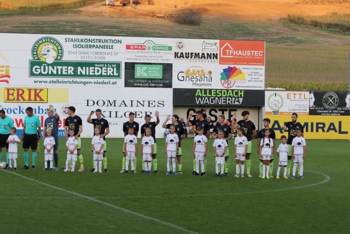 Guter Besuch und schönes Wetter beim Bezirksderby in Gnas. Rund 1.500 Besucher pilgerten ins neue Gnaser Stadion. Spieler der Nachwuchsmannschaften der U9 und U10 begleiteten die Spieler aufs Feld.