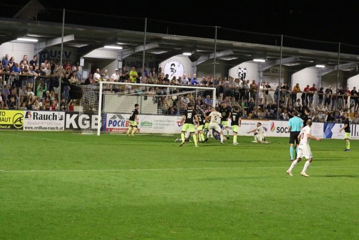 Nach einer Ecke trifft Stefan Strohmaier (rechts am Boden) nur die Querlatte....