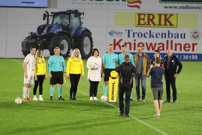Matchsponsor ADMIRAL, die Kapitäne beider Mannschaften, Kniewallner und Ratschnig sowie die Nationalratsabgeordnete Agnes Totter, Gnas-Vizebürgermeister Alois Sommer, das Schiriteam und USV Gnas-Präsident Schwarz stellen sich den Fotografen.