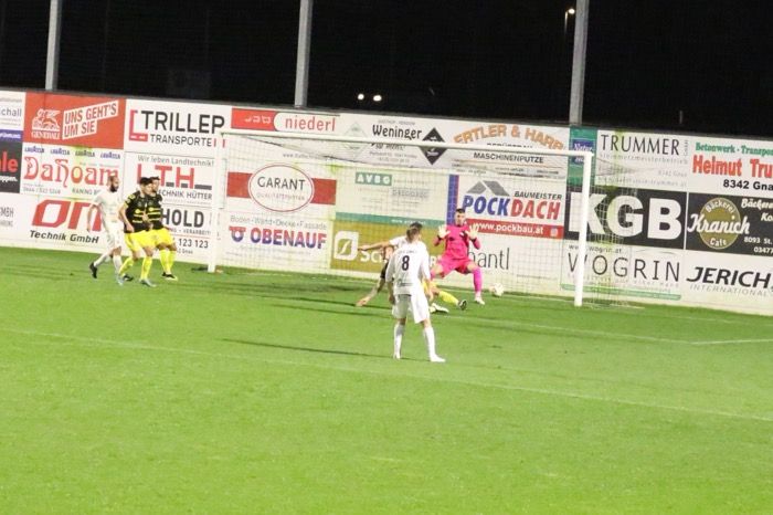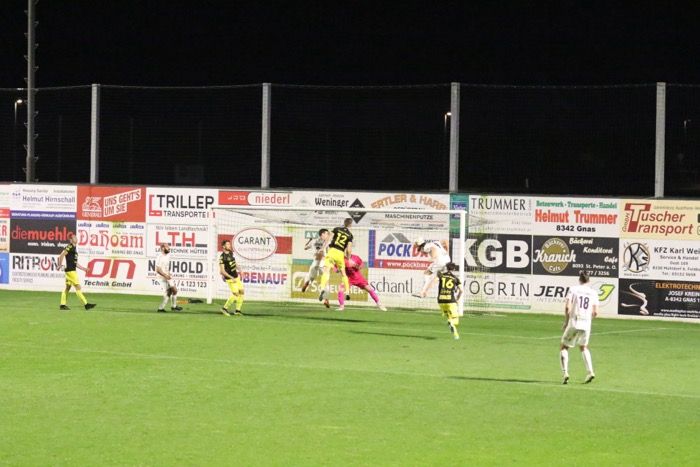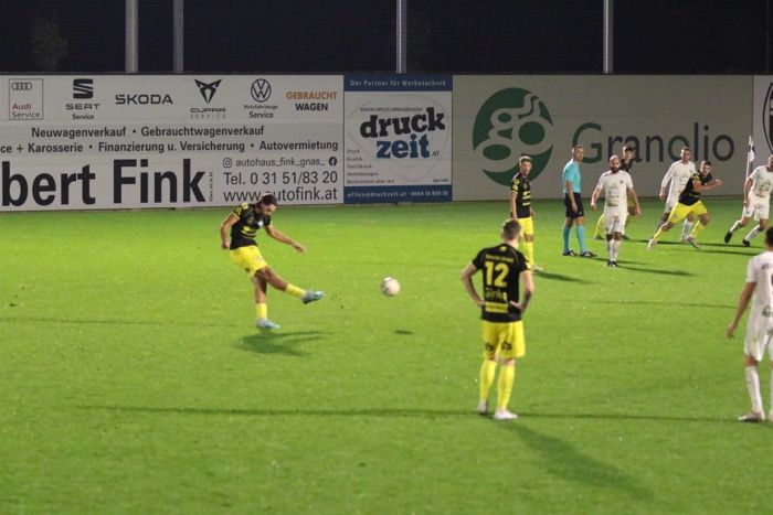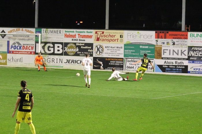 Ein Spiel, das lange Zeit auf sehr mäßigem Niveau geführt wurde, nahm erst ab der 40. Minute Fahrt auf, als es den Gnasern durch David Fink gelang, den 1:0-Führungstreffer zu erzielen. Fink war per Kopf nach einem Getümmel im Strafraum erfolgreich. In der Nachspielzeit der ersten Halbzeit legten die Gnaser nach und Johannes Unegg gelang aus kurzer Distanz das 2:0. Flanke von der linken Seite in den Strafraum, Johannes Unegg kam vor der zweiten Stange an den Ball und beförderte das Leder via Innenstange ins kurze Eck. Vor den beiden Toren bekamen die Fans kaum Torchancen zu sehen, es gab wenig Höhepunkte, sieht man von zwei Möglichkeiten für die Gäste ab - Marco Heibl schoss nach Zuspiel von Kapitän Lukas Ratschnig das Leder über die Querlatte (18.) und Ziga Skoflek verfehlte mit seinem Abschluss das Gnaser Tor nur knapp (22.).