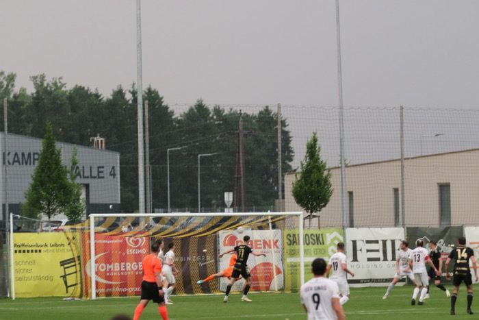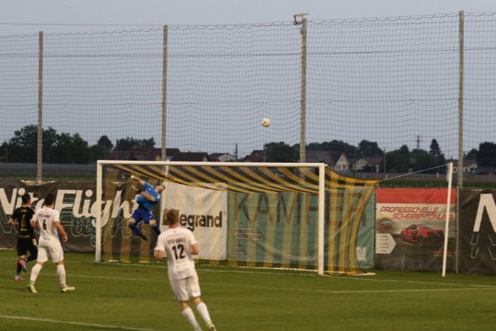 ...Tillmitsch-Goalie Gröbacher dreht das Leder über die Querlatte (17.).