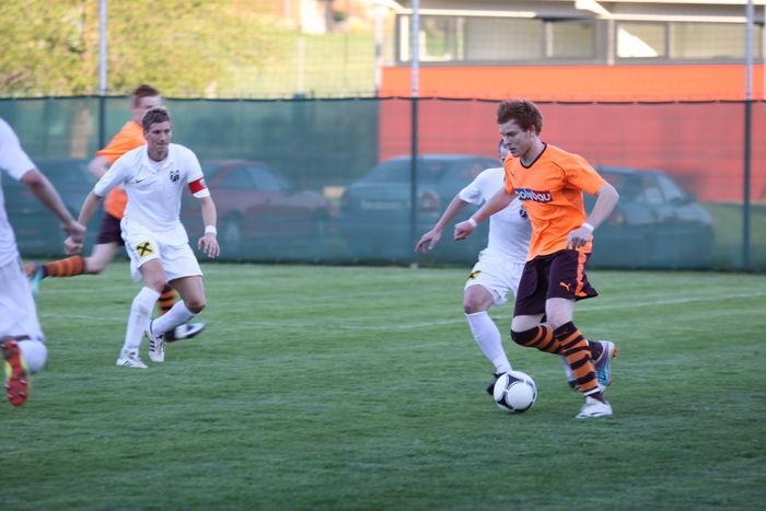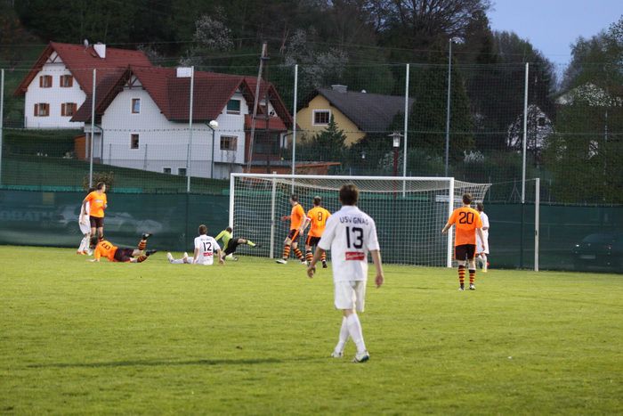 Nach schönem Lochpass von M.Schadler setzt sich Daniel Haas gegen Kapitän Dobnig (Nr.8) durch und schiebt den Ball an Torhüter Leiner vorbei ..