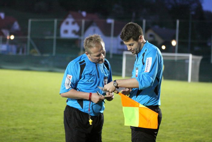 Schiedsrichter Bitai (links) und sein 1.Assistent Hofer stimmen sich bei einem Wechsel ab.