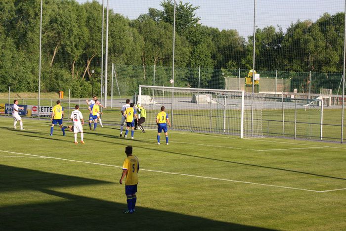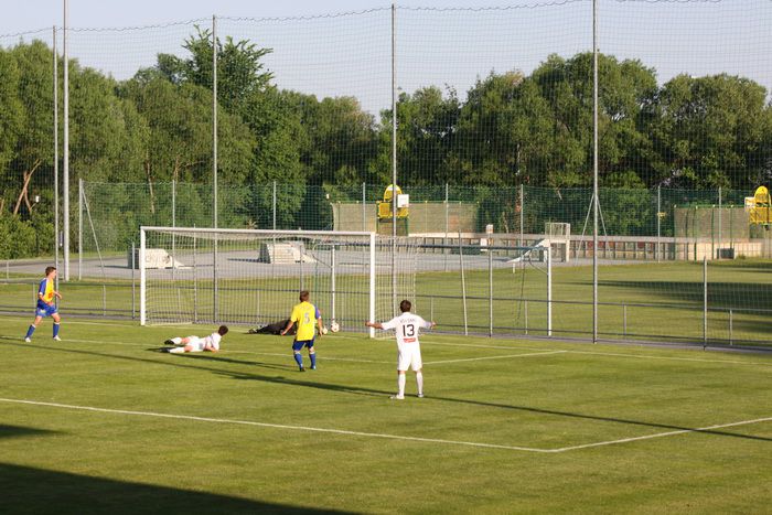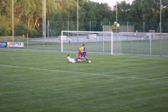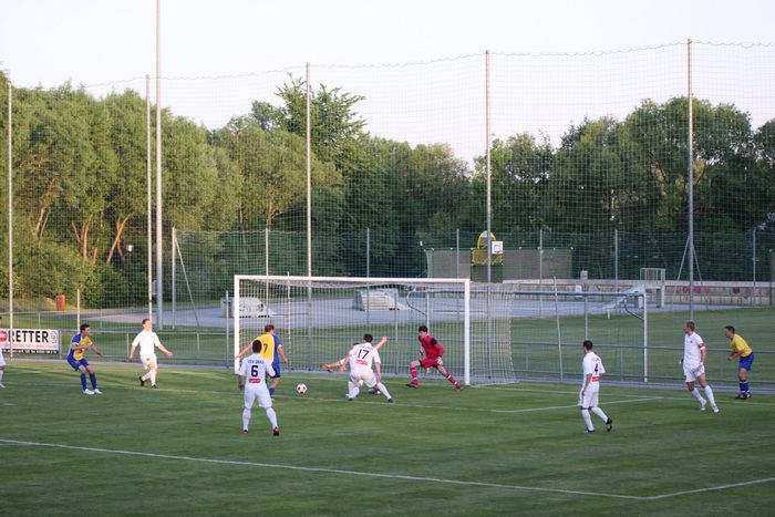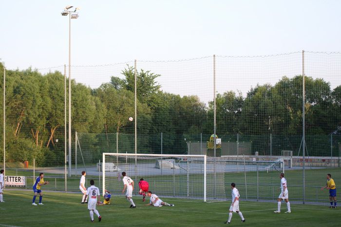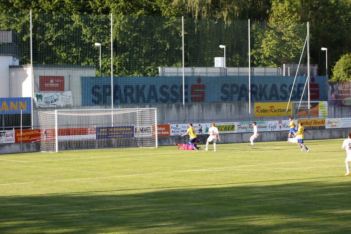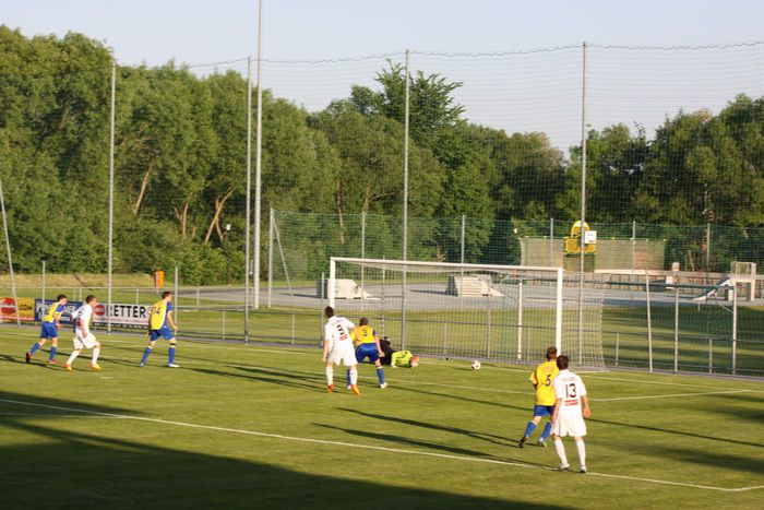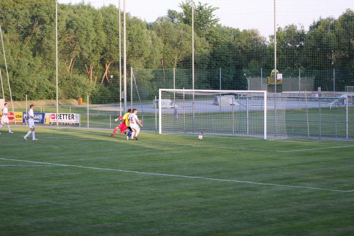 Kandlhofer (ganz links) befördert einen Eckball knapp am Tor von Roth vorbei (27.).