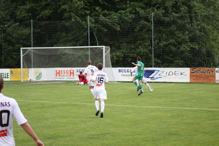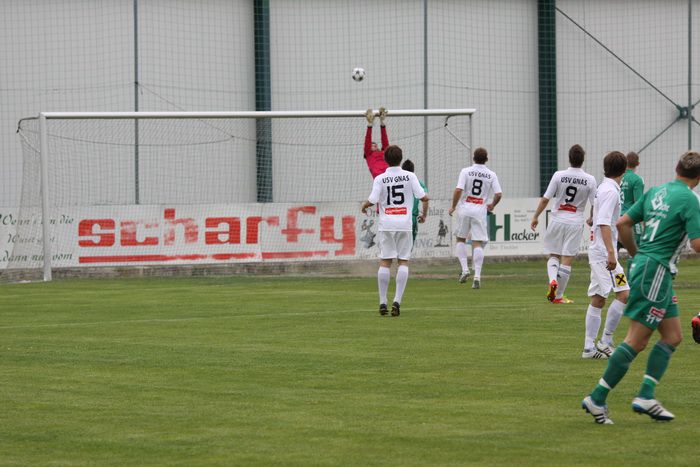 Bewusst um die Wichtigkeit dieser Begegnung starteten die Gnaser sehr nervös in dieses Derby. Bereits in der 1. Minute musste Gnas-Goalie Roth einen Freistoßball von Hopfer über die Querlatte drehen. Es folgten hintereinander zwei Eckbälle für die Hausherren ohne zählbarem Ergebnis. In der 10. Minute zeigten die Gäste erstmals bei einem Volleyschuss von Daniel Haas auf. Torhüter Tafilaj konnte den Ball zur Ecke klären. Gleich darauf versuchte es Winter, abermals konnte Tafilaj zur Ecke retten, wenig später vergab Christian Schadler. In der 14. Minute gab es nach einem Foul an J.Fink Freistoß für Gnas. Matthias Schadler donnerte den Ball zuerst in die Mauer, sein Nachschuss konnte wieder zur Ecke abgewehrt werden.