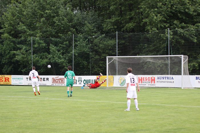 Matthias Schadler befördert einen indirekten Freistoßball in Richtung Straden-Tor...