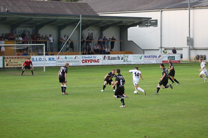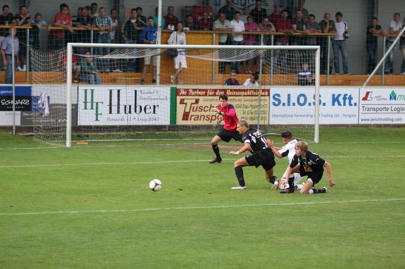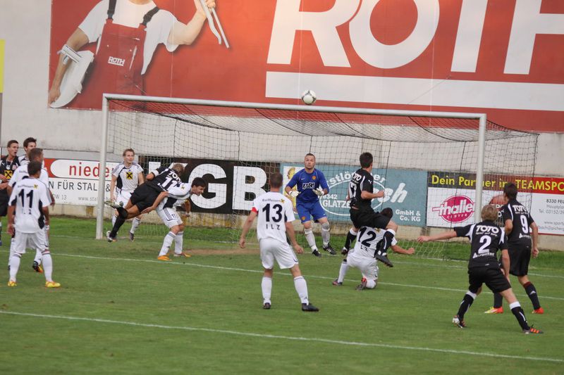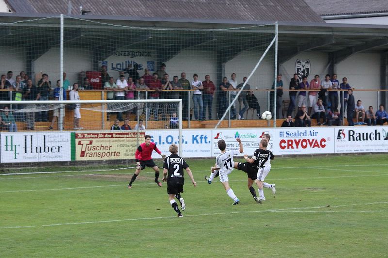 Nach einem Eckball trifft Christian Schadler(4.v.rechts) die Oberseite des Pfostens.
