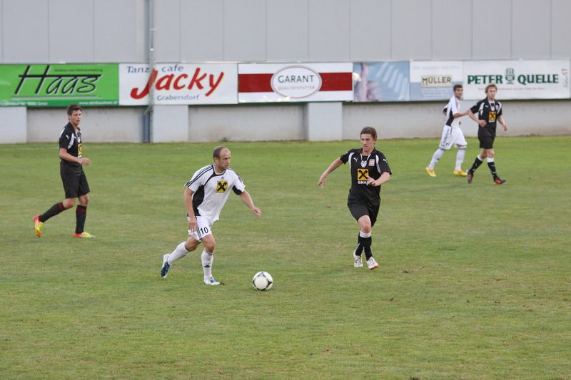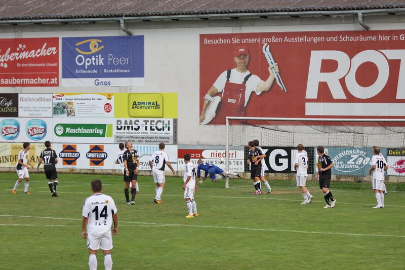 Langsam verflachte der Angriffsschwung der Gäste und in der 12. Minute konnte Ilz-Torhüter Eder erstmals einen J. Fink-Schuss abwehren. Bei einem schönen Angriff der Gnaser über die linke Seite zog Kniewallner in der 18. Minute ab, neuerlich war Eder auf dem Posten und konnte zur Ecke abwehren. Beim nachfolgenden Eckball traf Christian Schadler die Oberseite der Querlatte. Wenig später verfehlte Kniewallner bei einer scharfen Hereingabe von M.Schadler das Leder nur knapp (22.). Christoph Haas setzte einen Eckball per Kopf links an der Torstange vorbei (30.). Mit einem Roller von Obendrauf, der plötzlich vor Torhüter Eder auftauchte, hatte der Ilzer Schlussmann keine Mühe (39.). Kurz vor der Pause konnte Gnas-Keeper Roth einen 20 m-Freistoß von Deronjic halten.