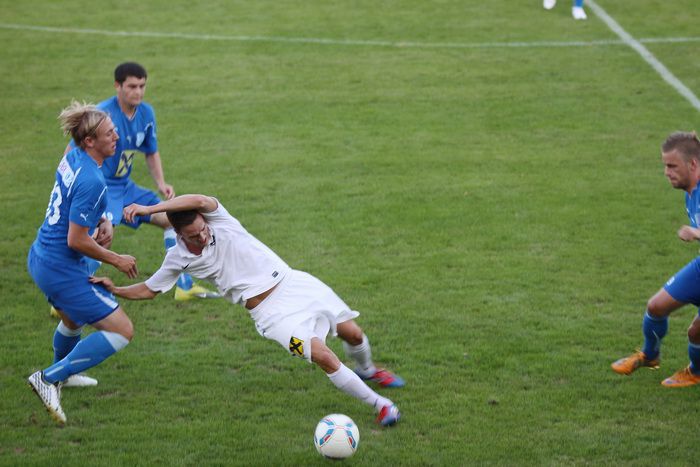 Christoph Haas spitzelt den Ball vor Repina zur Ecke.