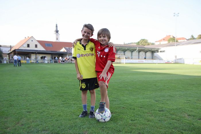 Die beiden Söhne von Gnas-Trainer Bez, Marcel (links) und dem sportlichen Leiter Andy Zach, Jan, freundschaftlich umarmt.